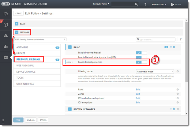 - Expand Settings → Personal Firewall and verify that Enable Botnet protection is enabled.